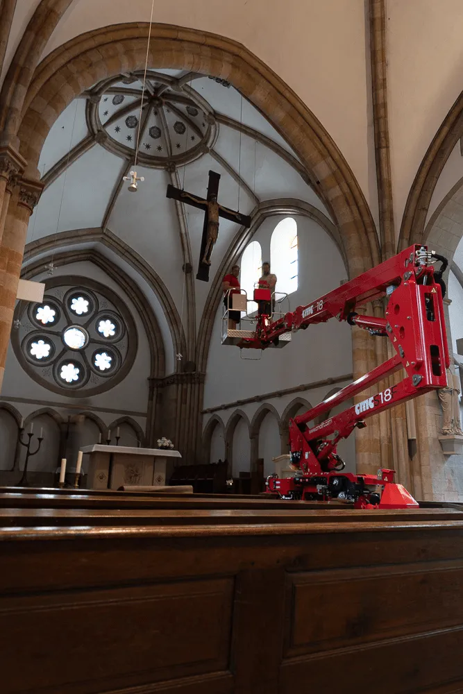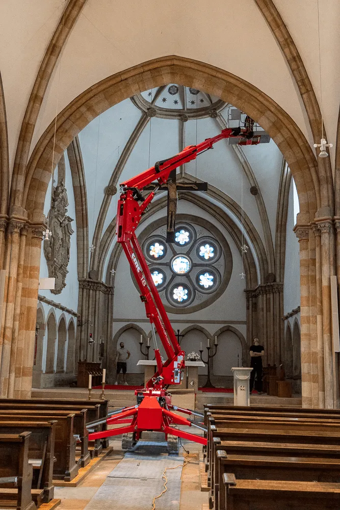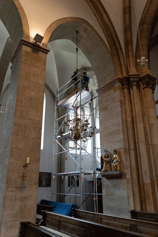 Ein besonderes Augenmerk lag auf dem Einsatz eines Spezial-Hubsteigers, mit dem Arbeiten in bis zu 18 Metern Höhe ermöglicht wurden – ohne die alten Kirchenbänke zu beschädigen. Die neue LED-Beleuchtung inklusive RGB-Steuerung wurde in enger Abstimmung mit Lichtplanern, Steinmetzen und Denkmalpflegern installiert.